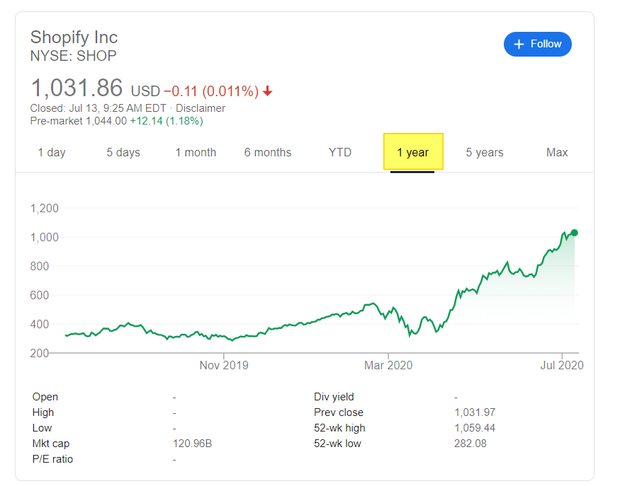 쇼피파이는 코로나19가 유행하면서 추락과 반등을 거듭하던 시장에서 유달리 주목받는 회사중 하나다. 쇼피파이 주가는 지난 한 해 동안 3배 가까이 상승해 시가 총액이 735억 달러(90조원)에 달하고 있는데, 최근에도 8일 연속 상승을 기록하는 등 올해 들어서만 53.4% 상승했고, 최근 최저치를 기록한 4월 2일 이후에만 82% 상승했다. 이는 같은 기간 동안 25% 오른 아마존이나 29% 오른 이베이(eBay) 같은 대형 전자상거래 업체들을 크게 앞지른 수치다.