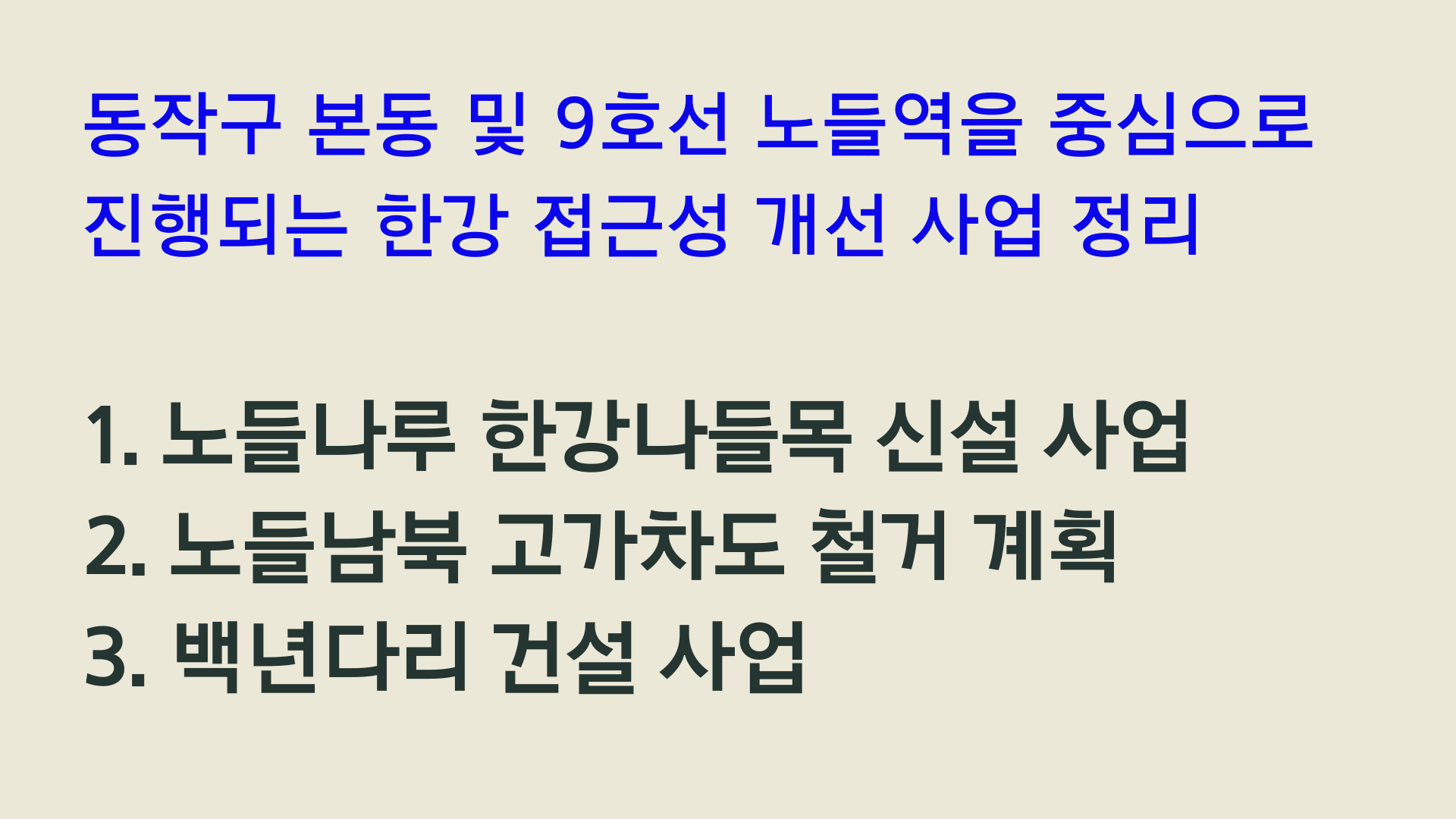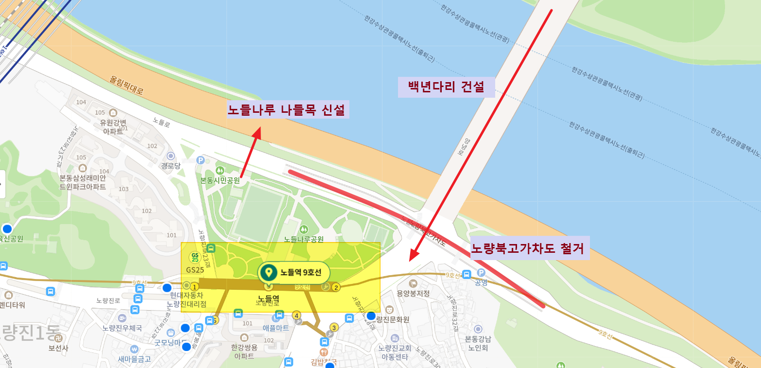 동작구 본동 및 9호선 노들역을 중심으로 진행되는 한강 접근성 개선 사업 정리