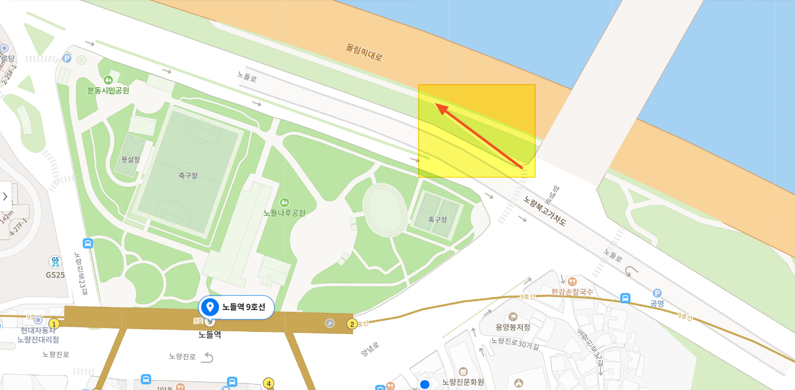 현재 노들역에서 한강에 접근하는 방법은 노들로를 건너서 한강대교 남단에서 한강대교 아래로 진입하는 자전거 도로를 이용(아래 그림의 화살표 방향)하는 것입니다. 많은 차들이 다니는 도로를 건너는 것은 누가봐도 위험합니다. 그리고 최근 다른 동네에 신설 개선된 한강 나들목과 비교하였을때 이 위치와 접근 방법은 정말 이해하기 어려운 상황은 분명합니다. 특히 노들역에 접하여 노들나루공원이 있음을 고려할때 이러한 개선의 필요성은 분명했습니다.