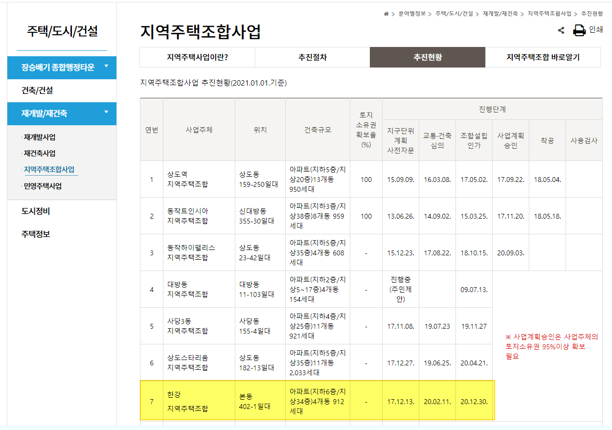 굿모닝마트가 폐업을 한 이유는 해당 부지가 본동 한강 지역주택사업 구역에 위치하였기 때문이라고 합니다. 그 사업구역 내에서 사실상 단일면적으로는 가장 큰 건물인 것으로 보였던 굿모닝 마트가 폐업을 하였다는 소식이 있었고, 이후 지난해 연말 20.12.30. 본동 한강지역주택조합은 동작구청으로부터 정식으로 조합설립인가를 받았습니다. 동 사실은 동작구청 홈페이지를 통해 확인 할 수 있습니다. 아래 그림은 동작구청 홈페이지를 캡쳐한 사진입니다. 즉, 그 동안 지지부진했던 본동의 한강지주택 사업이 다시 움직임이고 있다는 것으로 볼 수 있습니다.