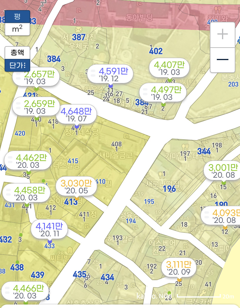 그렇지만 이 동네에 관심있는 분들이 눈여겨볼 부분은 분명 있습니다. 최근 거래된 한강 지역주택조합의 거래금액(평단가)입니다. 아래 사진을 통해 최근 19~20년 기간중 실거래 가격을 보면 사업 대상지의 토지 등을 매입한 금액이 평당 4000만원을 넘었다는 사실을 확인할 수 있습니다.