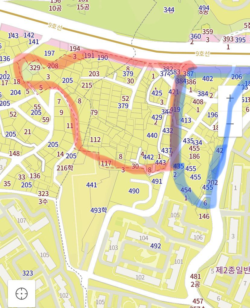일단 아래 지도를 보면, 노들역 5번 출구와 본동 삼성래미안 아파트(492번지) 사이 지역에서 2개 지역주택 사업이 추진되었습니다. 아래 지도에서 붉은 테두리 안쪽은 "본동 지주택" 대상지인데, 위치는 노들역에서 보다 노량진 방향임을 확인할 수 있습니다. 그리고 또 다른 지주택 사업인 "한강 지주택"은 파란색 테두리 안쪽이 사업대상지 인데, 지도에서 볼 수 있듯이 이 구역은 노들역 5번 출구와 붙어 있습니다.