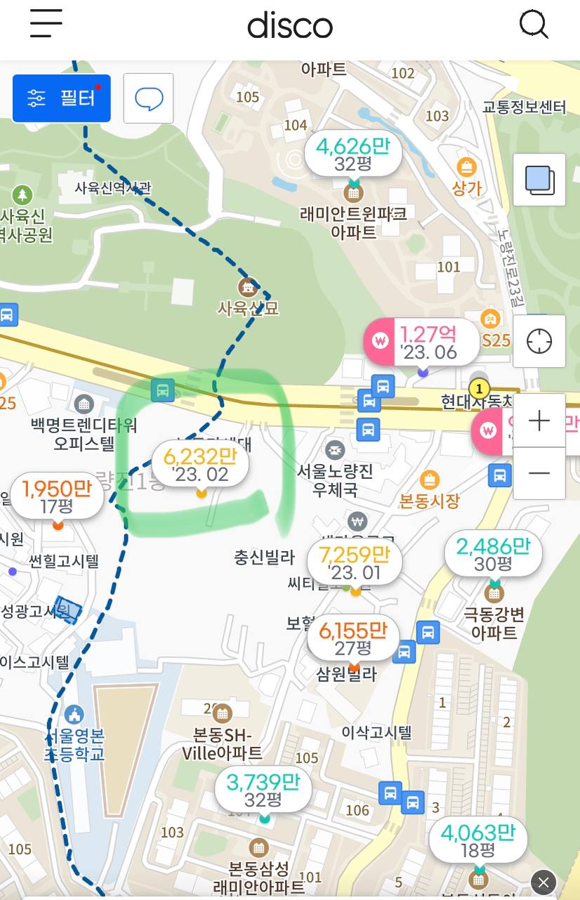 저도 이 대법원 판결 사실을 확인 한뒤, 하나의 퍼즐이 맞춰지는 느낌을 받았습니다. 아래 2023년 동작구 본동 지역내 부동산 거래현황을 보면 녹색으로 표시한 23.2월 거래내역이 있습니다(디스코 앱). 이 지역이 정확히 본동 444-1번지 일대의 대우 주복 사업이 예정된 지역입니다. 참고로, 오른쪽에 여러 거래내역은 '한강지역주택조합' 부지의 부동산 거래현황입니다. 사실 23.3월 거래는 상당히 뜬금없었다고 할 수있습니다. 대우 주복 사업이 표류된지도 한참 전인데, 갑자기 저 위치의 부동산 거래가 평당 6천만원을 넘긴 가격으로 이루어졌다니 도대체 영문을 알 수 없었습니다. 그런데 그 직후인 23.3월에 위 언급한 대법원 판결이 이루어지고 정말 본동 444-1번지 일대 대우주복 사업의 재개 가능성이 점쳐지고 있는 상황이 되어 버렸습니다. 다시말해, 지난 23.2월의 부동산 거래는 뭔가 앞으로의 방향을 미리 알기라도 한듯 한 의미를 가지는 거래였던 것입니다. 시간이 지나서 그 의미를 다시 찾게 된 모습입니다.