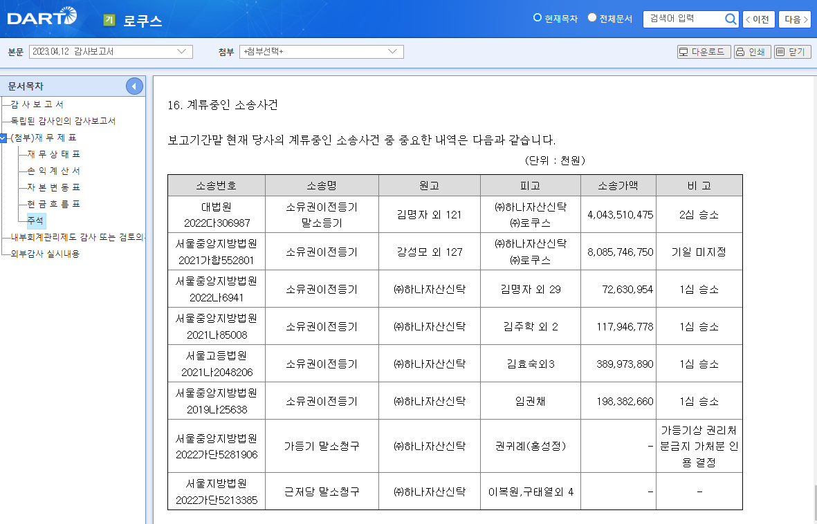 일단 아래 대우주복 사업의 시행사인 '로쿠스'의 2022년도 감사보고서상 계류중인 소송 사건에 매년 기재되어온 "소유권 이전등기 말소 등기"소송 등 관련 소송 내역입니다. 그간에도 동 내역을 업데이트 해왔는데(이전글 : 동작구 본동 대우건설 주상복합 건설사업(444-1번지 일대) 관련 소송 진행현황), 사실 이 소송들이 그간 여러해에 걸쳐 진행되어 오면서 언제 이 소송이 끝나고 대우주복 사업이 다시 진행될 수 있을까? 막연한 기대감만 가지고 있었습니다.