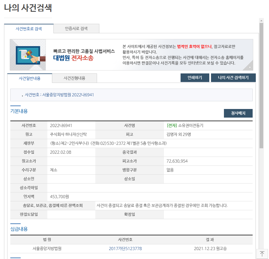 그런데 아래 최근 대법원 사건조회 검색 결과를 살펴보겠습니다. 대우 주복 사업 관련 소송 현황 중 가장 중요한 소송인 소유권 이전등기 관련 소송이 2023.3.30. 대법원 판결이 있었고, 원고 패소 결정이 대법원에서 확정되었습니다. 1심, 2심 모두 원고가 패소하였고, 대법원에서도 동일하게 원고가 패소하였습니다. 결국 시행사인 로쿠스와 그 부동산 신탁사인 하나자신탁이 해당 부지에 대한 소유권이 인정되었다는 결정입니다.