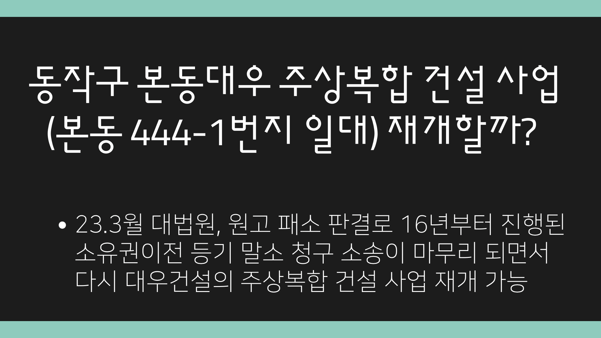 오랜만에 동작구 본동 444-1번지 일대에서 추진되어온 대우주복 관련 소송 현황을 업데이트합니다.