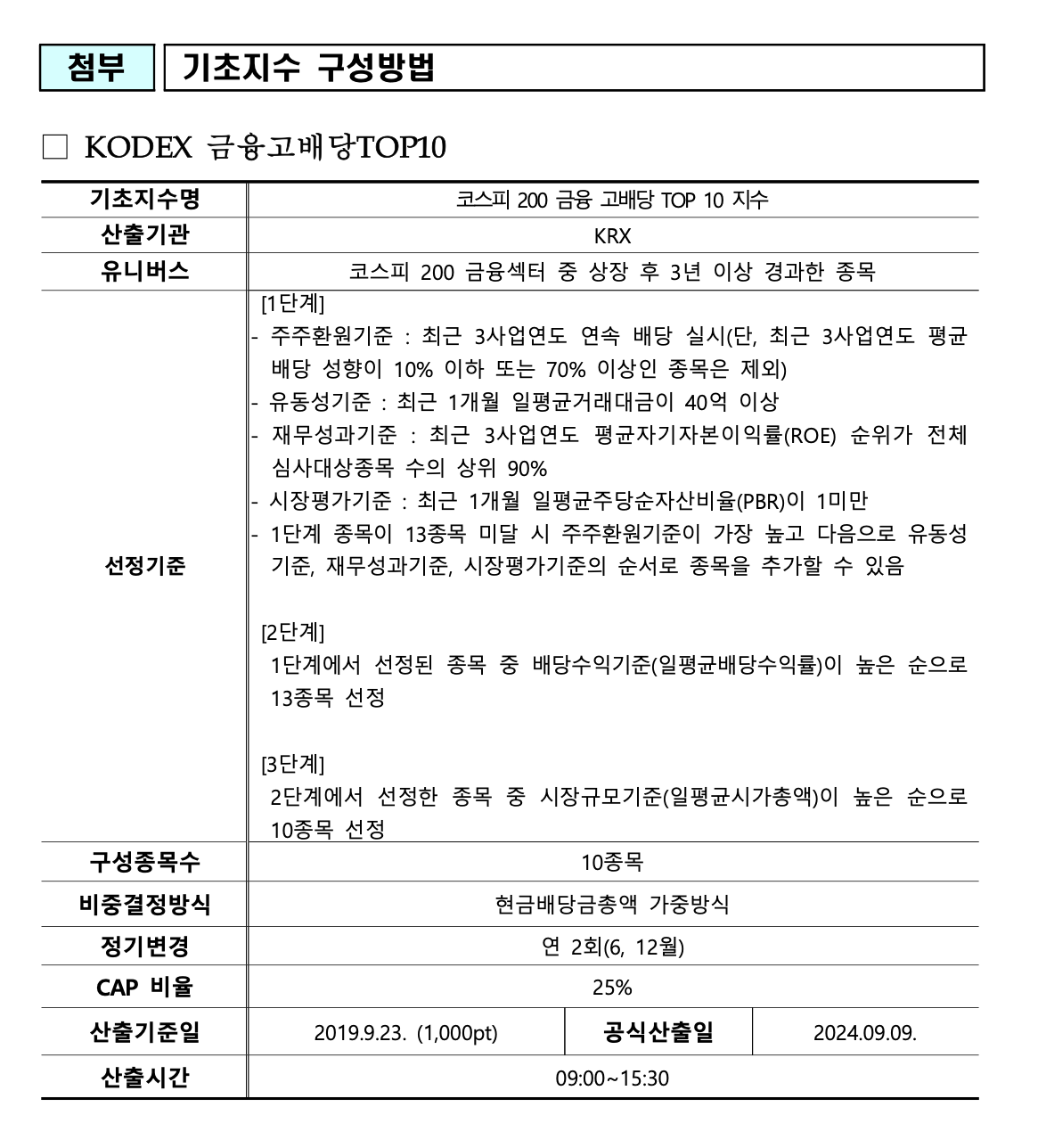 - 핵심요약 : 코스피 200 금융섹터 종목 중 고배당 관련 기준을 충족하는 상위 10종목에 투자하는 패시브 상품