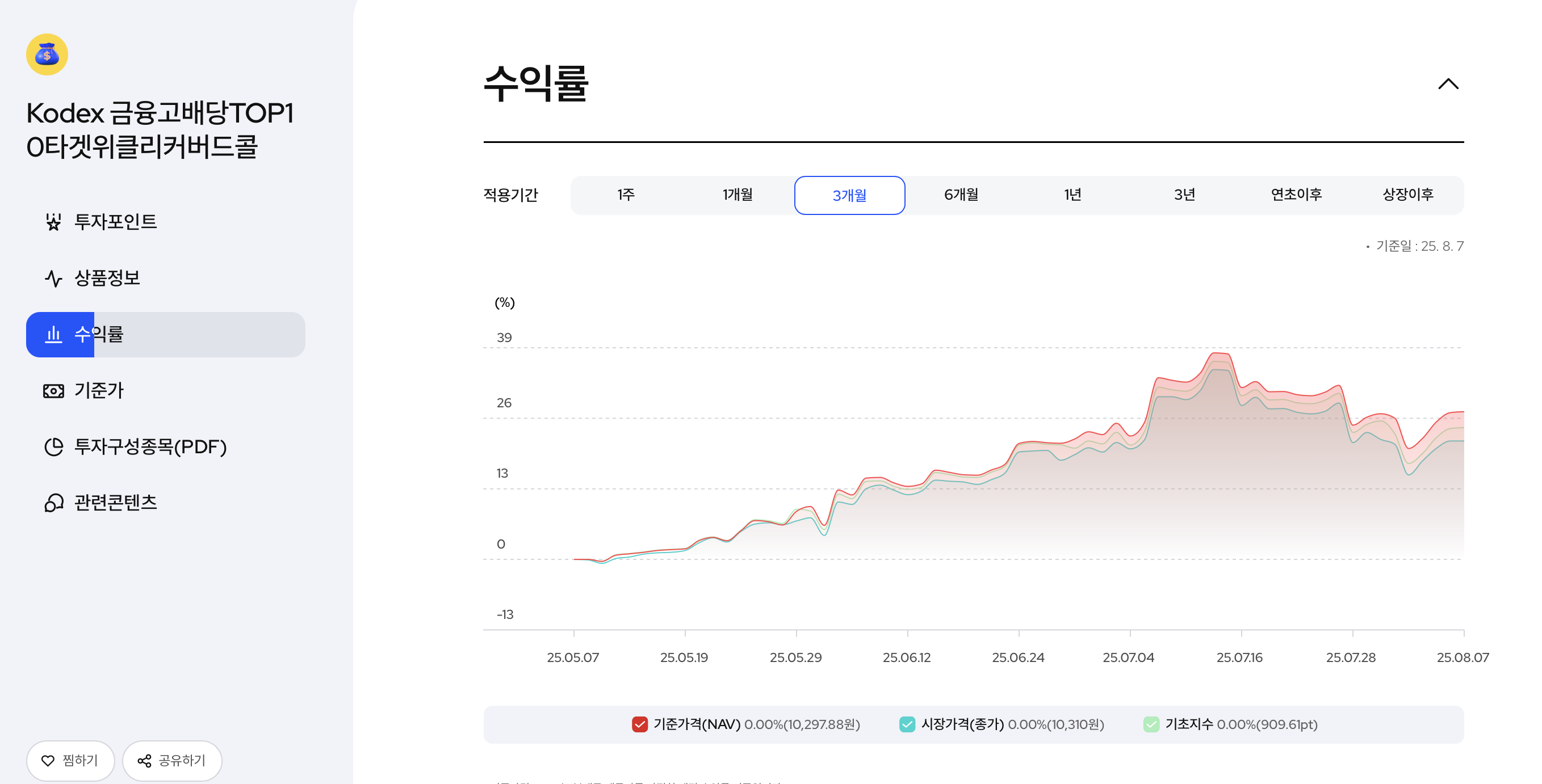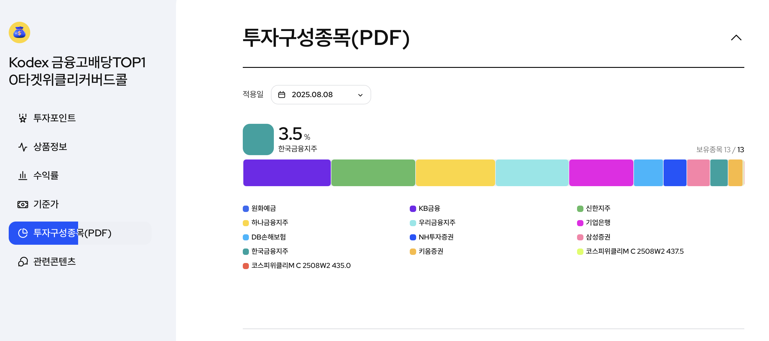 ‼️ 새 정부의 새로운 자본시장 정책이라는 트렌드에 부합하기 위해 출시한 상품이라고 해야할까? 고수익을 추구하는 투자자들에게는 별로 매력적이지 않겠지만, 중단기적으로 새로운 정부는 기업들의 '배당'에 대해서 계속 강조할 가능성이 높아보이고 국내에서 가장 '배당'에 신경을 쓰고 배당을 많이 할 것으로 기대되는 업종은 단연 금융업권이기 때문에 배당주로 분류되는 금융회사들에 대한 투자적 관심은 계속 유지가 될 가능성이 높다. 그런 측면에서 나름 시기적인 관심을 반영한 상품이라고 볼 수 있다.