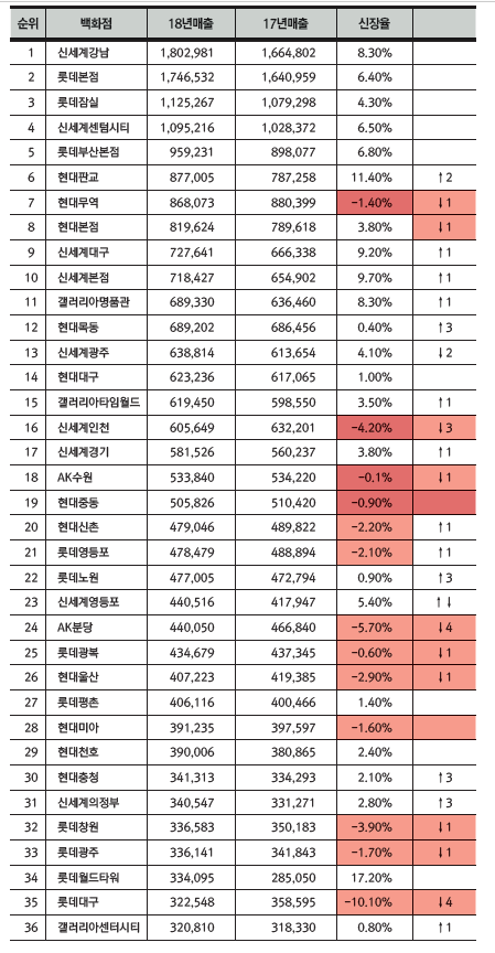 2018년 백화점 매출 순위를 보면 강남 신세계 백화점이 1위, 그리고 롯데백화점 본점이 2위를 기록하였다. 비단 2018년뿐만 아니라 거의 매년 백화점 매출 순위를 보면 일부 변동은 있지만 항상 상위에 위치하는 서울내 백화점은 강남지역과 명동의 백화점이 대부분을 차지한다. 상위권에는 부산에 위치한 백화점과 최근에 판교에 들어선 백화점도 포함되기도 한다.