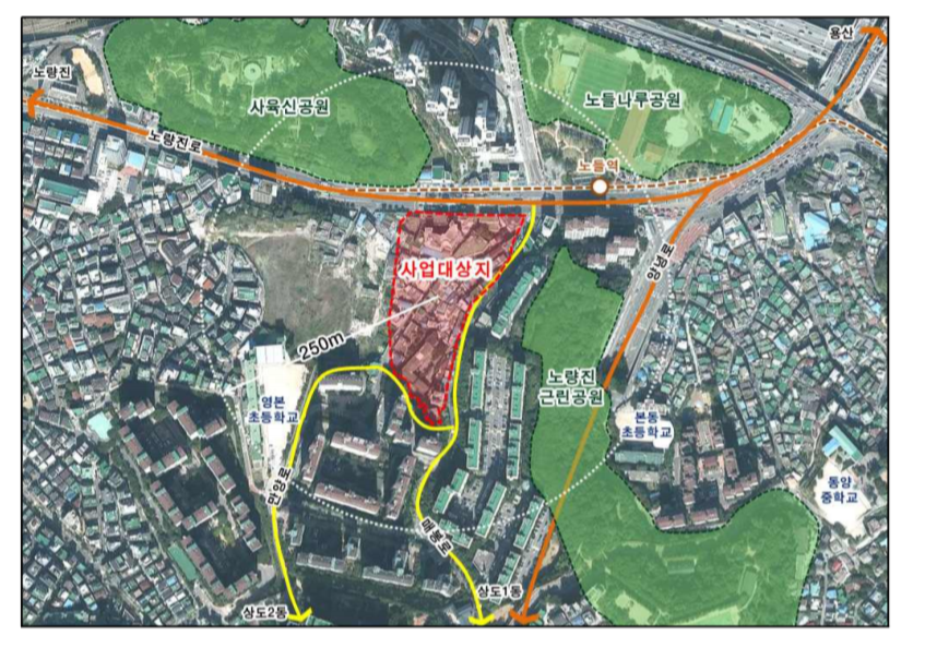 다른 포스트를 통해서도 설명했지만, 동작구 본동의 위치가 위치인 만큼 대우건설의 사업 이외에도 이 지역에서 추진되었던 지역주택개발사업이 또 있었다. 그 위치는 아래 사진(붉은색 음영의 "사업대상지")에서 확인할 수 있듯이 대우건설 부지의 바로 맞은편 부지였다. 나란히 마주보는 두 지역에서 주택개발사업이 추진되었음을 보면 본동이 어떻게 가치를 평가받았는지 알수 있을 것 같다. 그런데 또 공교롭게도 두 개의 개발사업은 현재까지 완료되지 못한채 미완의 사업으로 남아있다. 그 내용은 다시 설명하겠지만, 결국 이런 히스토리가 있어서 동작구 본동이 엄청난 입지에 위치함에도 불구하고 그다지 높게 평가받지 못하고 있는 이유가 되고 있다.