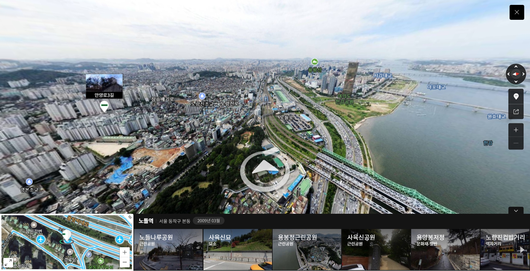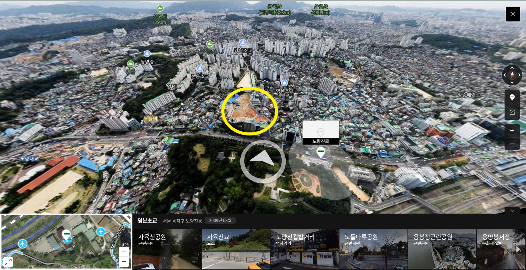 동작구 본동의 입지가 매우 매력적이다는 점을 계속 강조하고 있는데, 재미있게도 네이버 지도에 2009년 3월 당시의 동작구 본동의 항공뷰 사진을 확인할 수 있어서 본동의 입지를 다시 한번 체감할 수 있었다. 아래 사진의 노란원의 위치가 서울의 금싸라기땅 중 하나로 평가받는 동작구 대우건설 부지다. 아래 사진에서 확인할 수 있듯이 과거 2009년 당시에 이미 이 부지를 통한 개발사업을 진행하고 있는 것을 볼 수 있다. 지금은 사업이 중단되고 이 부지가 방치되고 있는 상황이지만 아직도 대우건설은 이 부지에 대한 계획을 포기한것은 아님을 여러가지 정보를 통해 확인 할 수 있다. (아래 관련글 참조) 그리고 그 아래 2개 사진은 동작구 본동에서 흑석동 방향(왼쪽 사진), 그리고 여의도 방향(오른쪽 사진)으로 바라본 네이버 지도의 항공뷰(2009년 기준) 사진이다. 본동의 입지의 매력을 사진으로 느껴볼 수 있다.